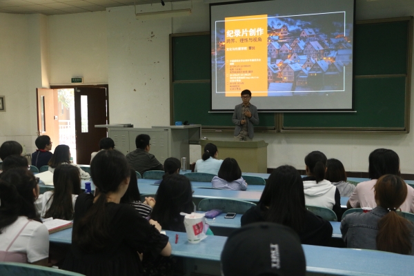 曹锐老师以《纪录片创作——理性、跨界和视角》为题,向到场的同学们和老师们讲解了纪录片创作相关知识。第一部分“宏观审视:当下中国纪录片的困境”,用详实的数据讲解了中国纪录片发展现状与遇到的问题,第二部分“微观分析:一个简单的纪录片案例”,以BBC纪录片《数学的故事:宇宙语言》片头为例,从画面、解说词、音乐、节奏等多个方面,使用语言学、逻辑学等相关专业知识进行深入浅出分析。