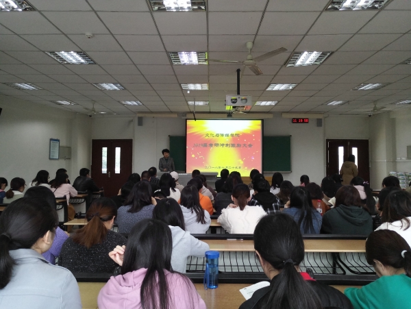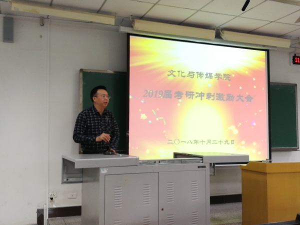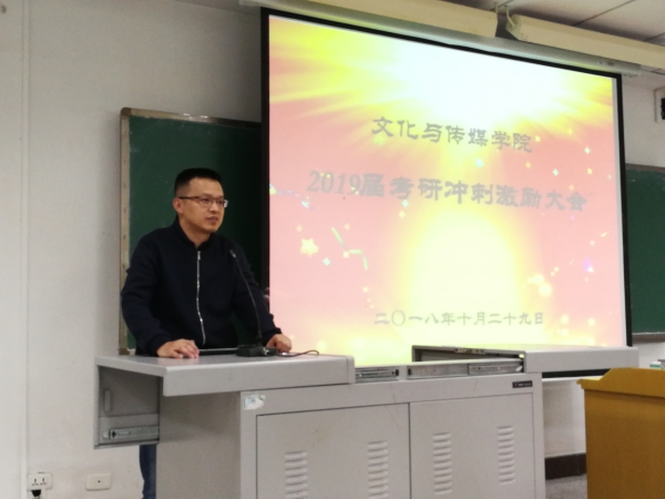 为强化m88.com考研学生的考研积极性,让学生进一步坚定考研信心、明确目标、激发斗志。m88.com于10月29日上午11点在知津楼D202举办了2019届考研冲刺激励大会。m88.com关工委成员、全体领导班子成员、学工办主任刘友洪与2019届辅导员张雪、余建荣老师出席了大会。会议由文化与传媒学院党总支书记白成良主持,2019届80名考研学生代表参加了此次激励大会。