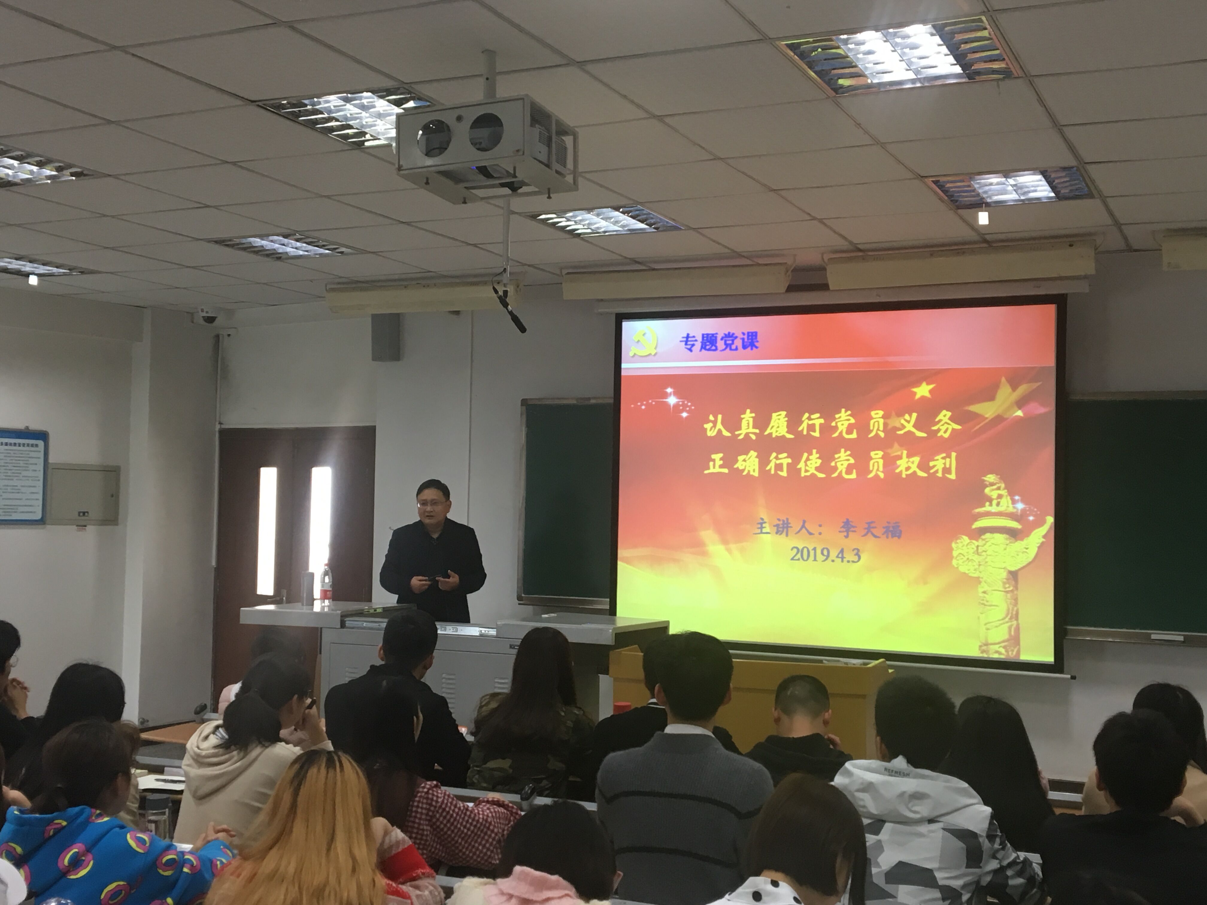 4月3日下午,m88.com在知津楼D304开展了以“认真履行党员义务,正确行使党员权利”为主题的专题党课。院长李天福为党校学员和本期发展对象授课。
