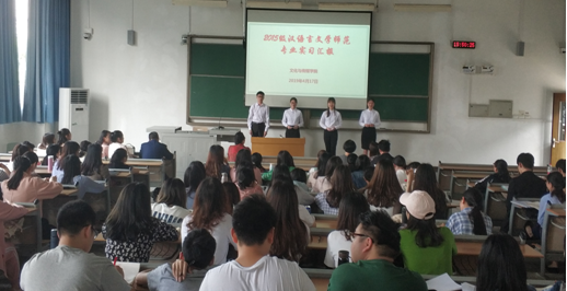 2019年4月17日下午,2015级汉文师范专业实习汇报暨2016级汉文师范专业试讲领航课在知津楼7阶隆重举行。文化与传媒学院副院长李芹燕、中文系主任黄贤忠、语文教育教研室主任李东平等15名试讲指导教师、4名2015级优秀学生代表以及2016级汉文师范全体学生参加了本次汇报。