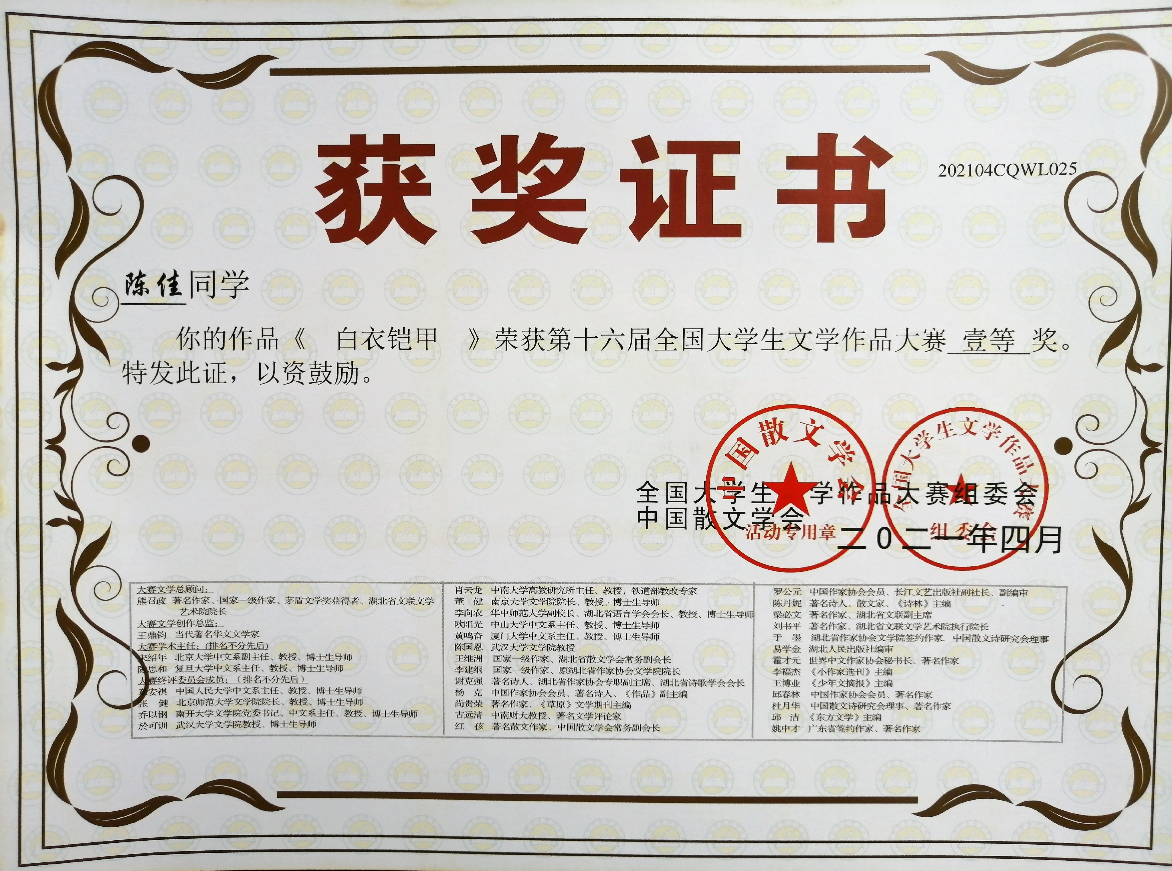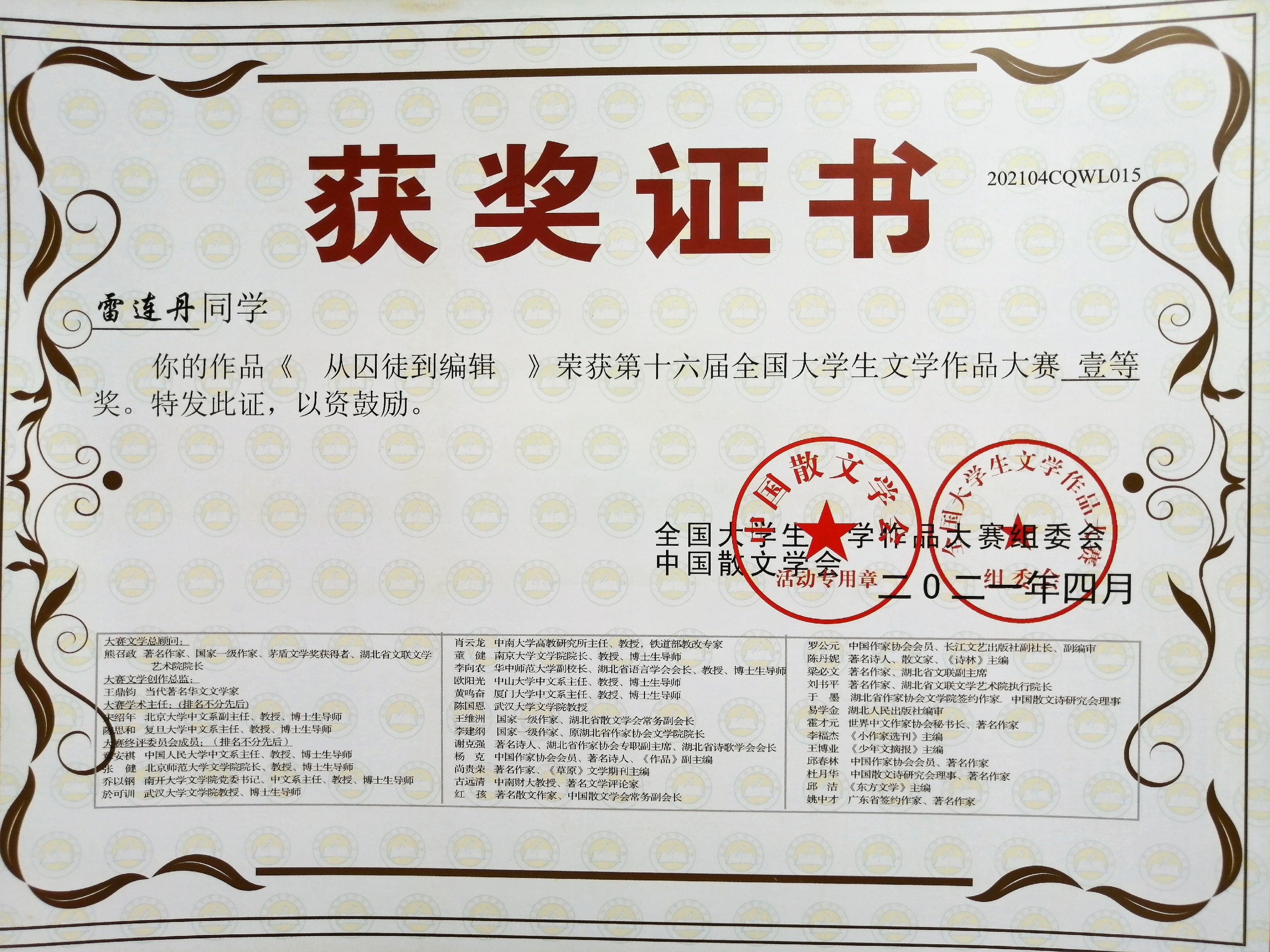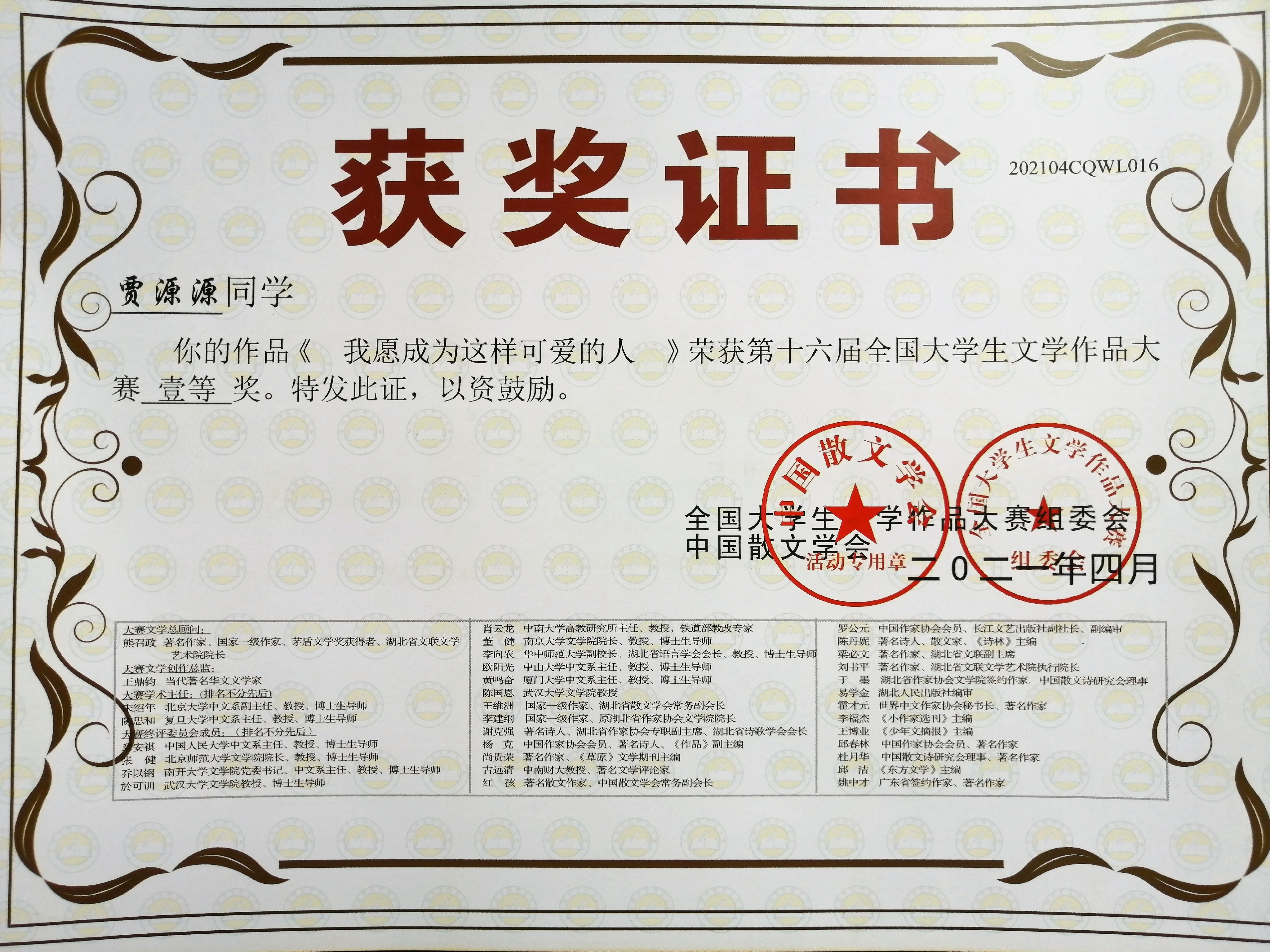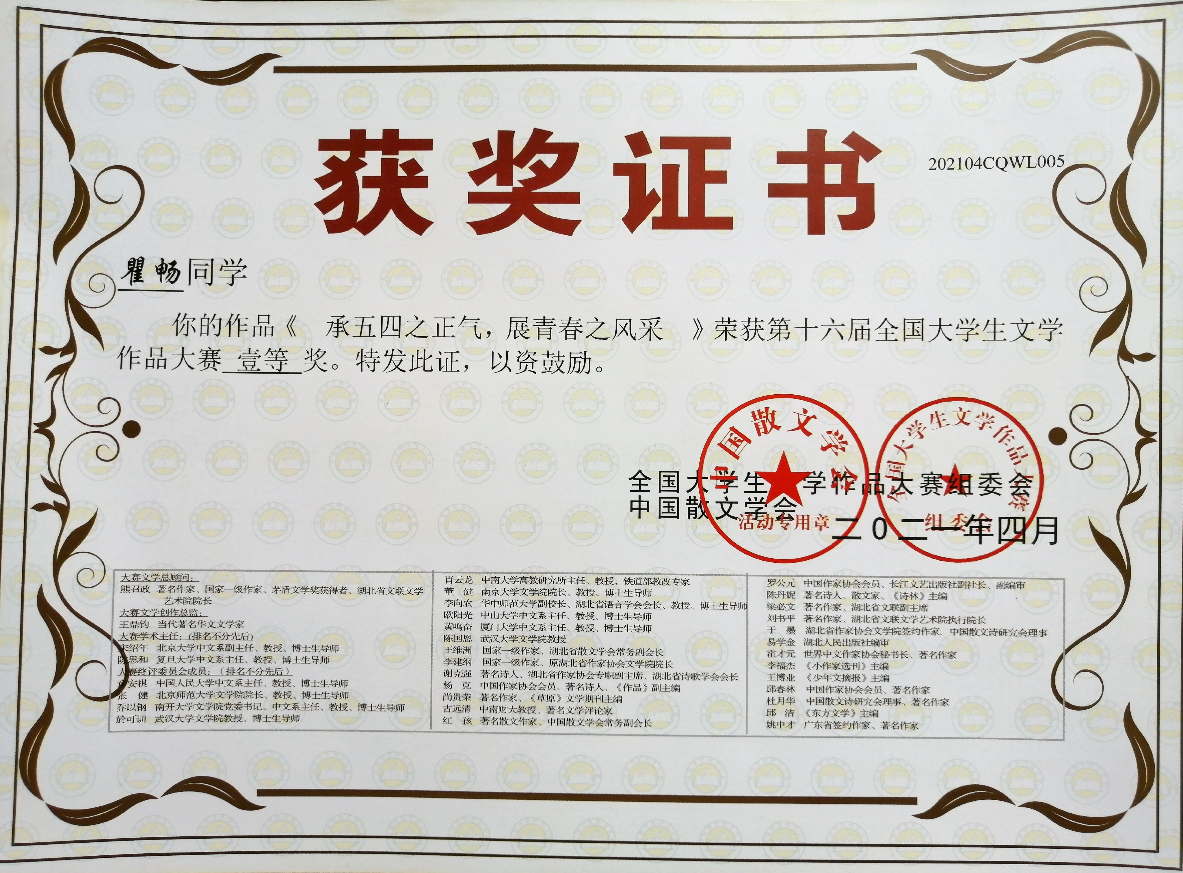 近日,第十六届全国大学生文学作品大赛评选结果揭晓,m88.com学子再获佳绩,共22件作品获奖,其中瞿畅、雷连丹、贾源源、陈佳荣获一等奖;陈燕红等6名同学荣获二等奖;王晨等12名同学荣获三等奖。