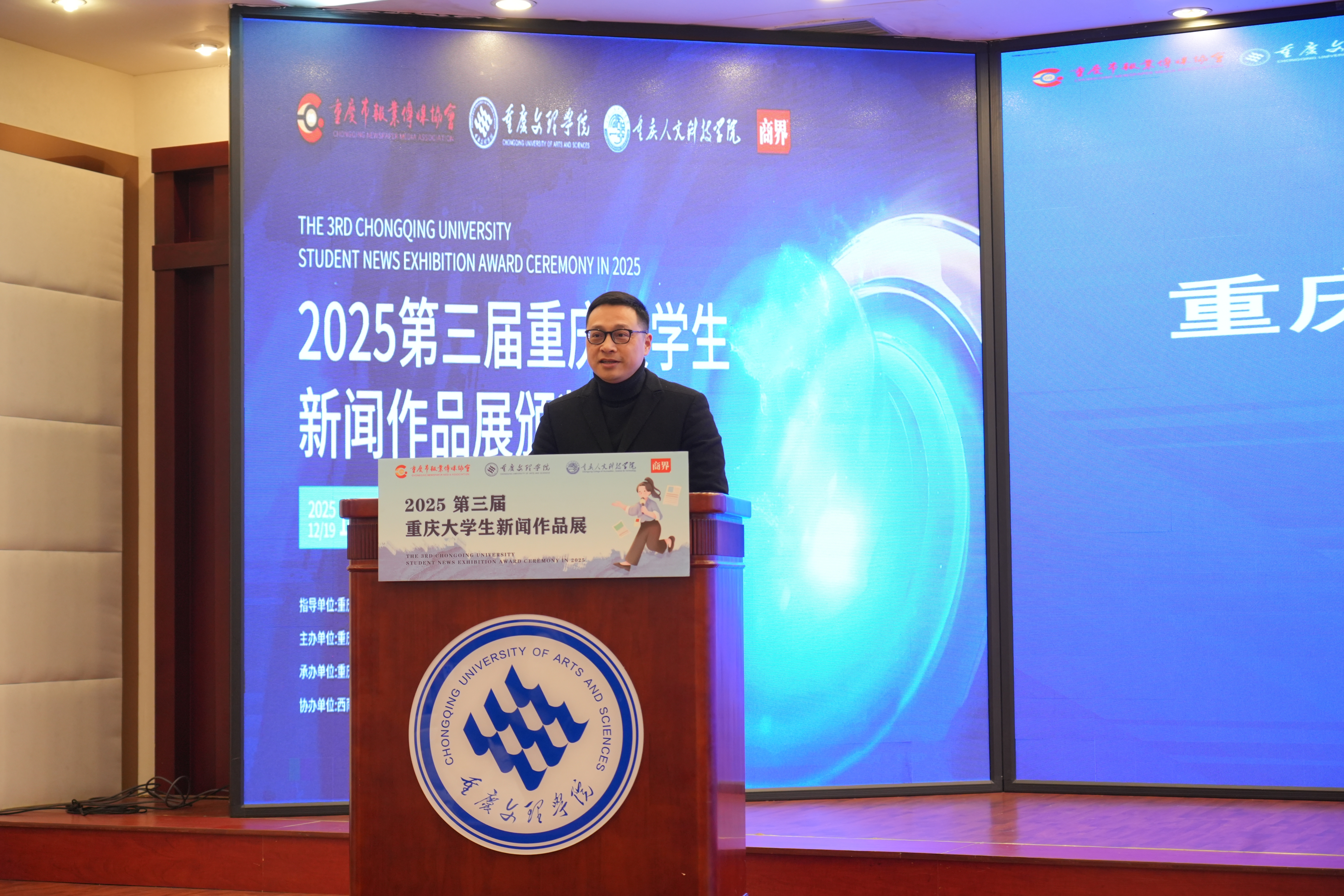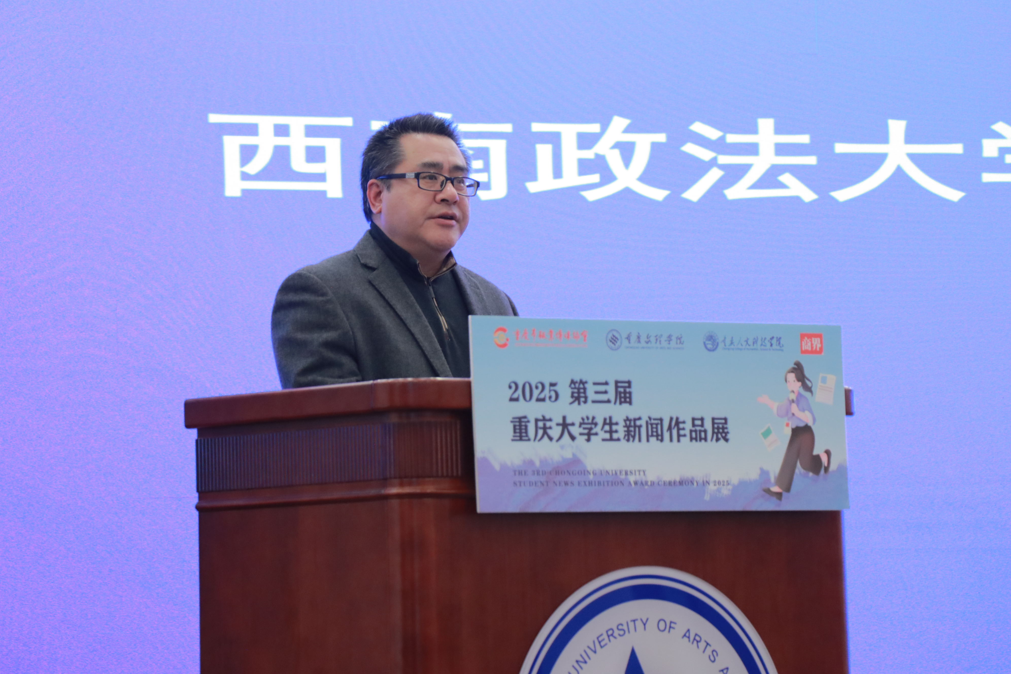 12 月 19 日,由重庆市报业传媒协会、重庆广播电视和网络视听协会广播影视高等教育专业委员会指导,m88.com、重庆人文科技学院文学与新闻学院及商界青年部联合主办的第三届重庆大学生新闻作品展颁奖盛典在学校恪勤楼304室隆重举行。重庆市政协常委、重庆市文化文史和学习委员会副主任、重庆市报业传媒协会会长向泽映,重庆广播影视高等教育专委会秘书长谷李,学校党委常委、副校长李天福,以及来自全国各地 50 余位传媒专家学者、获奖团队及新闻爱好者共 200 余人,构建起一场兼具专业性与影响力的传媒领域交流盛会。